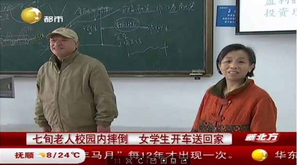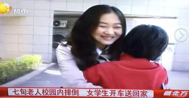 2016年5月15日上午,一对年迈苍苍的老夫妇带着辽宁卫视都市频道新北方栏目组来到东北大学大成教学馆,只为寻找一位善良、热心、乐于助人的姑娘。3月12日,市民刘大娘在东北大学校园内散步时不小心跌倒,恰巧被这位好心的姑娘发现,搀扶着刘大娘并将其安全的送到家中便转身离去。经检查刘大娘的身体并无大碍,但是她的心中始终惦念着那个将她扶起的姑娘。经过跟老伴商量后,他们想通过媒体的力量找到这位姑娘,对她说一句衷心的谢谢。