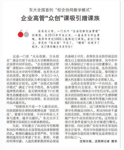 近日,《东北新闻网》和《沈阳日报》,分别以《消灭“低头族”,迎来“蹭课团”》和《东大全国首创“校企协同教学模式”,企业高管“众创”授课吸引“蹭课团”》为题对我院开设的《企业创新创业管理》课程进行了报道。