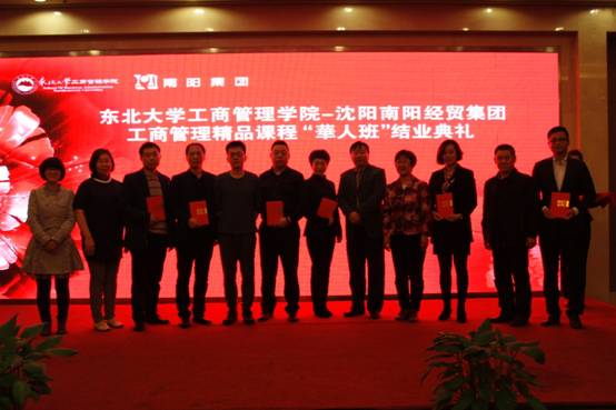 2016年10月16日,沈阳南阳经贸集团中高层管理人员领导力提升“华人班”的结业典礼暨东北大学工商管理学院与沈阳南阳经贸集团建立战略合作伙伴关系签约仪式在沈阳华人国际酒店圆满举行。东北大学工商管理学院郝树满书记,授课教师代表窦胜功老师、张兰霞老师、郭德仁老师、贾建锋老师、李亚宁老师,学院高培中心国丹青老师出席了本次活动。沈阳南阳经贸集团总裁杨鑫先生、副总裁刘晨先生、黄约信先生、王英女士携“华人班”全体学员参加了结业典礼。