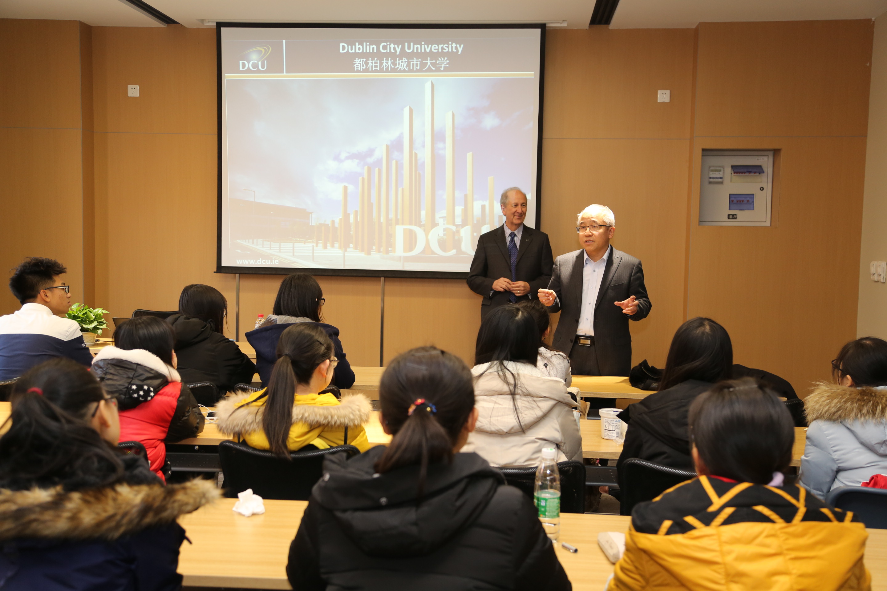 随后, Bernard Pierce和Yuhui Gao 系统地为工商管理学院学生解读了《东北大学工商管理学院与爱尔兰都柏林城市大学商学院3+1+1联合教学项目》,从地理位置、经济发展、文化传统等方面介绍爱尔兰的风土人情和都柏林城市大学的校园环境及氛围、学校资源及设施等,并着重介绍了都柏林城市大学商学院的特色,解答了学生们的提问。