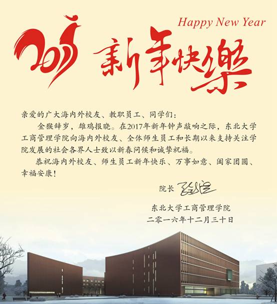 金猴辞岁,雄鸡报晓。在2017年新年钟声即将敲响之际,东北大学工商管理学院向海内外校友、全体师生员工和长期以来支持关注学院发展的社会各界人士致以新春问候和诚挚祝福。
