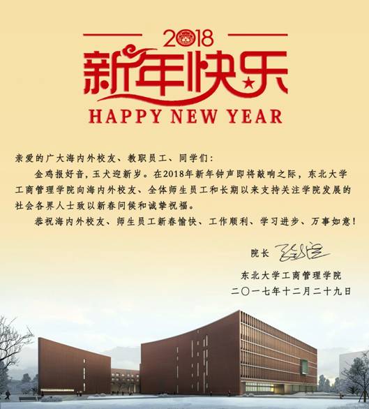 金鸡报好音, 玉犬迎新岁。在2018年新年钟声即将敲响之际,东北大学工商管理学院向海内外校友、全体师生员工和长期以来支持关注学院发展的社会各界人士致以新春问候和诚挚祝福。