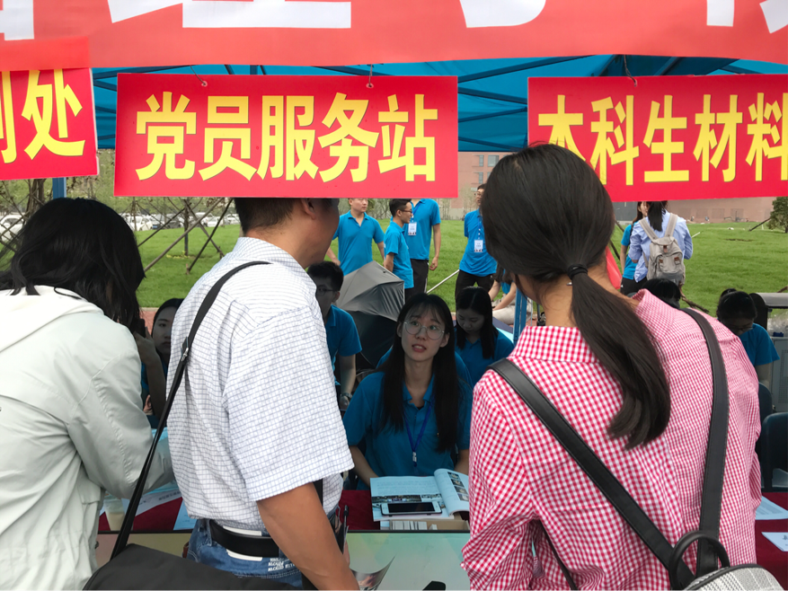 在烈日与大雨中,党员志愿者们仍然坚守岗位,协助报到登记、主动搬运行李、帮忙布置寝室、发放党员服务卡、介绍校园情况,及时解答新生与家长关于报到、学习、生活的相关问题。