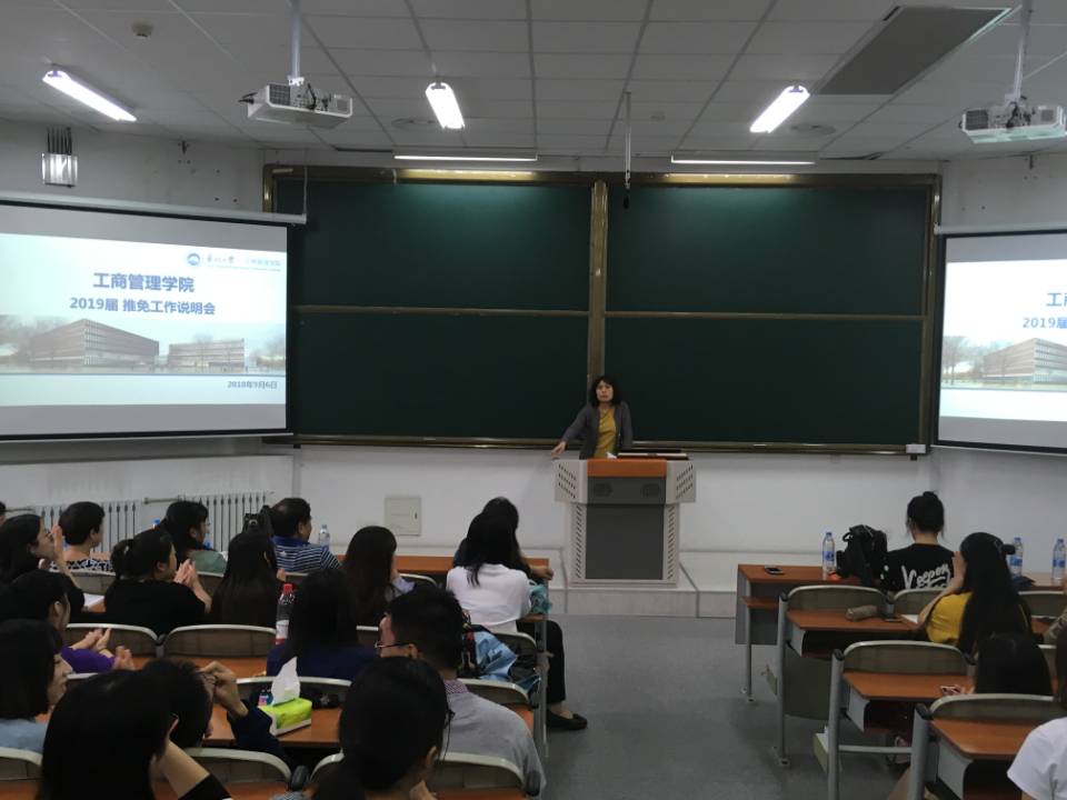 2018年9月6日下午2:30,工商管理学院2019届推免工作说明会于文管A447顺利召开。工商管理学院副院长郁培丽、研究生课程项目中心主任郭伏、韩颖、杜晓君、孙世敏、戢守峰、郭莉、于丽萍、宁烨出席本次大会,2015级相关学生参会学习。