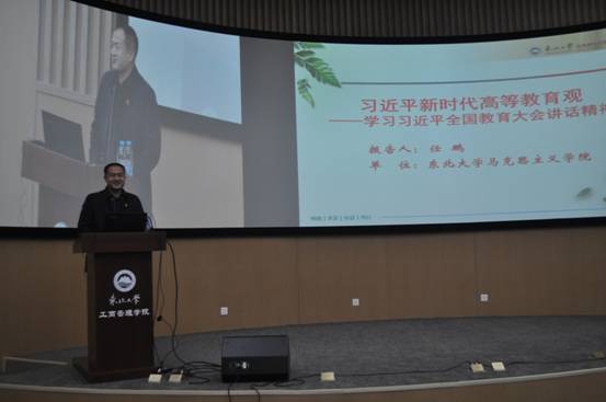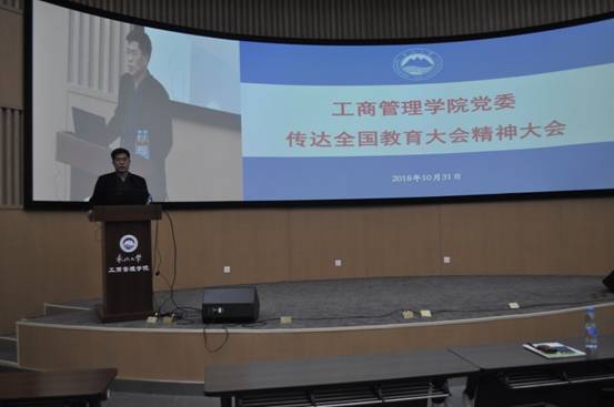 2018年10月31日,工商管理学院党委在浑南校区文管学馆B450会议室,召开全院教职工大会,传达全国教育大会精神,邀请我校马克思主义学院副院长任鹏作报告。学院党委书记郝树满主持了大会。