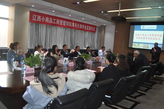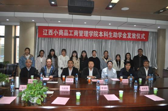 2018年11月12日,工商管理学院举行 2018年“辽西小商品工商管理学院本科生助学金”发放仪式。辽西小商品批发市场服务有限公司总经理孙德玉,大连银行沈阳分行副行长何正金,大连银行沈阳铁西支行行长刘玉春,沈阳新经纬金属材料有限公司总经理李学军,工商管理学院院长马钦海、党委书记郝树满、副院长赵红梅、党委副书记兼副院长严立宁出席现场。活动由严立宁主持。