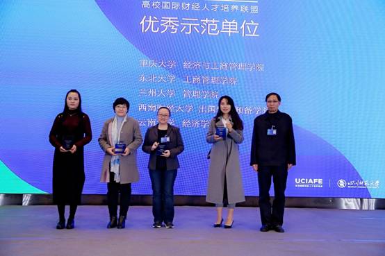 为了表彰高校在国际化财经项目中做出的努力和贡献,与会期间为优秀高校颁发了奖项,东北大学工商管理学院荣获“优秀示范单位”。许波老师代表工商管理学院领奖。