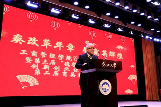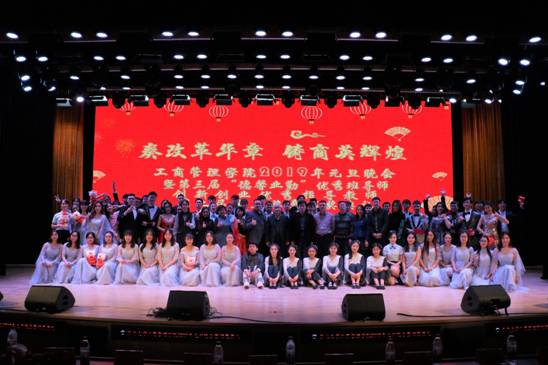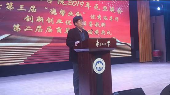 12月25日18:10,工商管理学院2019年“奏改革华章,铸商英辉煌”元旦晚会暨第三届“德馨业勤”优秀班导师、第二课堂创新创业优秀指导教师、第二届商英奖章颁奖典礼于浑南校区图书馆报告厅举行。东北大学副校长孙雷、校纪委副书记王剑、学生工作处处长马天威、浑南校区管委会副主任张哲、校党委宣传部副部长史鉴、校团委副书记刘海军、学生指导服务中心副主任石昌远、创新创业学院副院长贾建锋、工商管理学院院长马钦海、学院党委书记郝树满、学院副院长樊治平、学院副院长赵红梅、学院党委副书记兼副院长严立宁、学院院长助理蒋忠中、好睿教育集团北方区域负责人王雪、和君咨询合伙人兼沈阳和盛咨询有限公司总经理徐洪力以及学院各学系专任教师及机关老师出席晚会。工商管理学院各年级学生参与本次晚会。