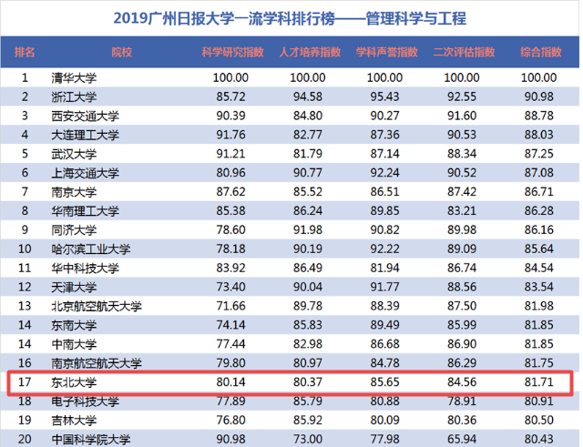 6月19日,广州日报数据和数字化研究院(GDI智库)发布“2019广州日报大学一流学科排行榜”,主要是对国内大学高水平学科进行评估排行。其中东北大学管理科学与工程学科总排名17位。