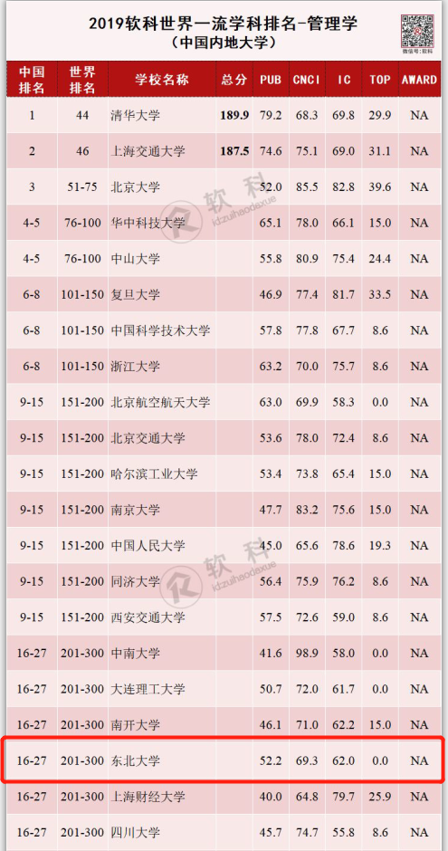 “2019年软科世界一流学科排名”于2019年6月26日正式发布。排名使用一系列国际可比的客观学术指标对全球大学在相关学科的表现进行测量,包括科研规模、科研质量、国际合作、高水平科研成果、国际奖项等。这次学科排名涉及人文社科领域管理学、工商管理、公共管理、图书情报管理等学科,其中,在中国内地大学管理学学科排名中,东北大学总排名19。
