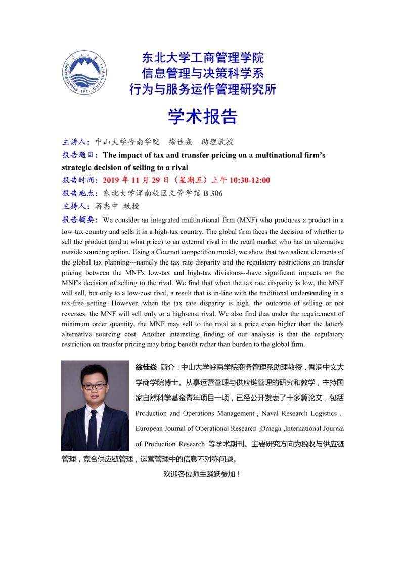 邀请中山大学岭南学院徐佳焱助理教授学术报告