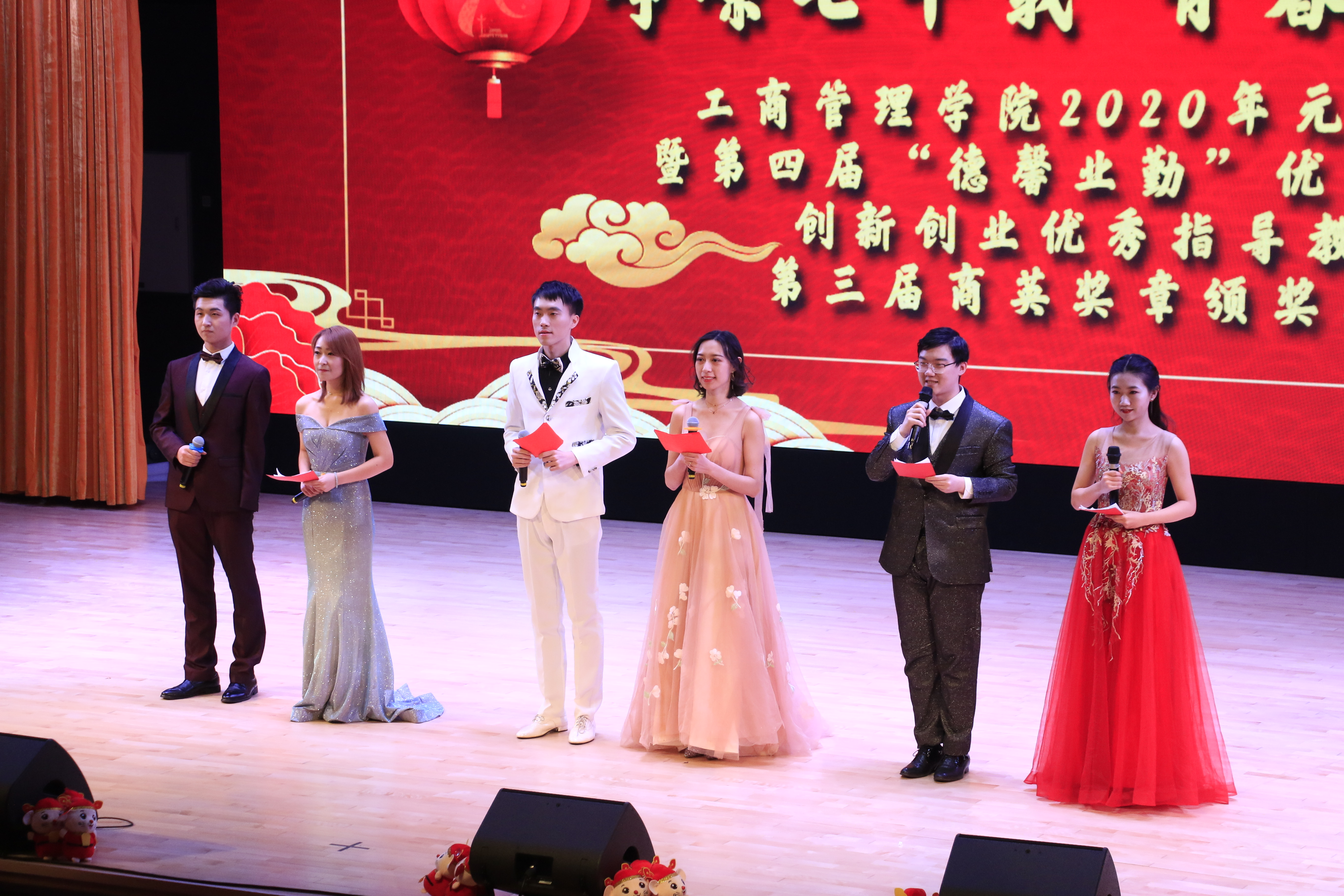 12月25日晚,工商管理学院2020年“峥嵘七十载,青春新时代”元旦晚会暨第四届“德馨业勤”优秀班导师、第二课堂创新创业优秀指导教师、第三届商英奖章颁奖典礼于浑南校区图书馆报告厅举行。校党委宣传部常务副部长闫研、学生指导服务中心主任刘云飞、学生工作处副处长韩磊、校团委副书记孙涛、创新创业学院副院长王刚、公安处副处长王克新、新疆内派指导教师阿米娜、林洪磊、付新红;工商管理学院院长蒋忠中、党委书记郝树满、副院长贾建锋、副院长赵红梅、党委副书记兼副院长严立宁以及学院各学系专任教师及机关老师和学生家长出席晚会。工商管理学院各年级学生参与本次晚会。
