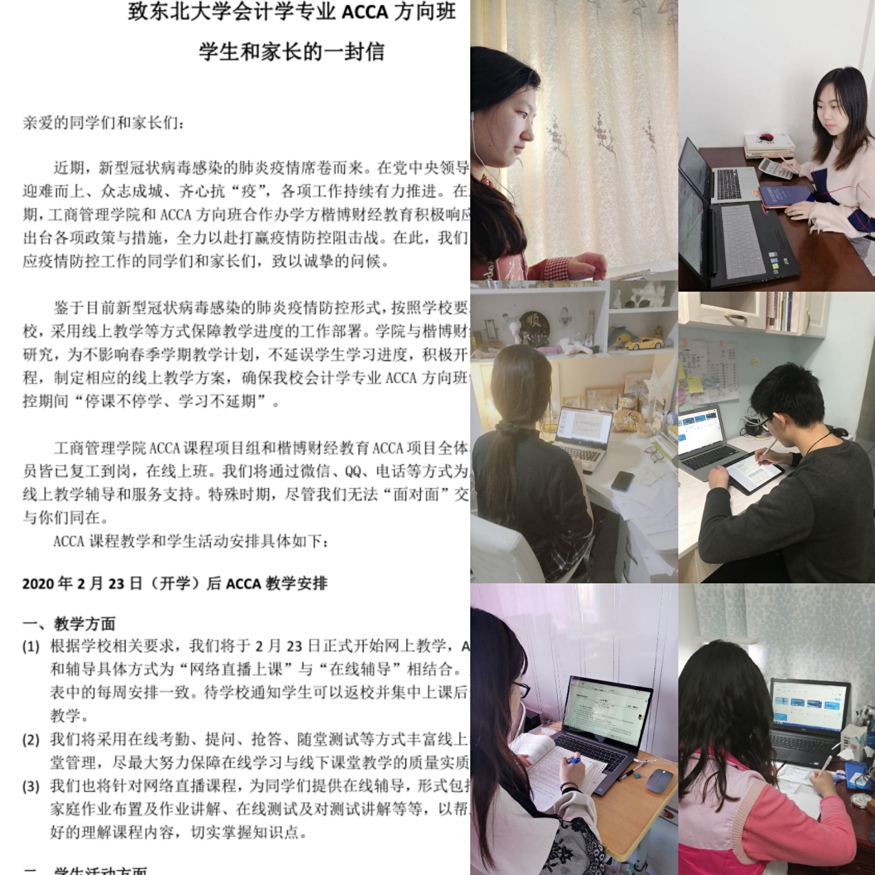 在学生开课前一周,向全体方向班同学送去“致东北大学会计学专业ACCA方向班学生和家长的一封信”,传达学校和学院精神,引导学生保持良好心态,树立坚定信念,积极配合全民抗疫的总要求,认真进行线上学习。