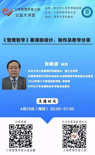 4月23日20:00-21:00,工商管理学院副院长孙新波教授以线上直播的形式开展“《管理哲学》慕课的设计、制作及教学分享”专题讲座。讲座时长约一小时,累计观看人数达到四千六百余人。本次公益讲座在教育部工商管理教学指导委员会直播平台和工商管理学者之家平台同时开展。