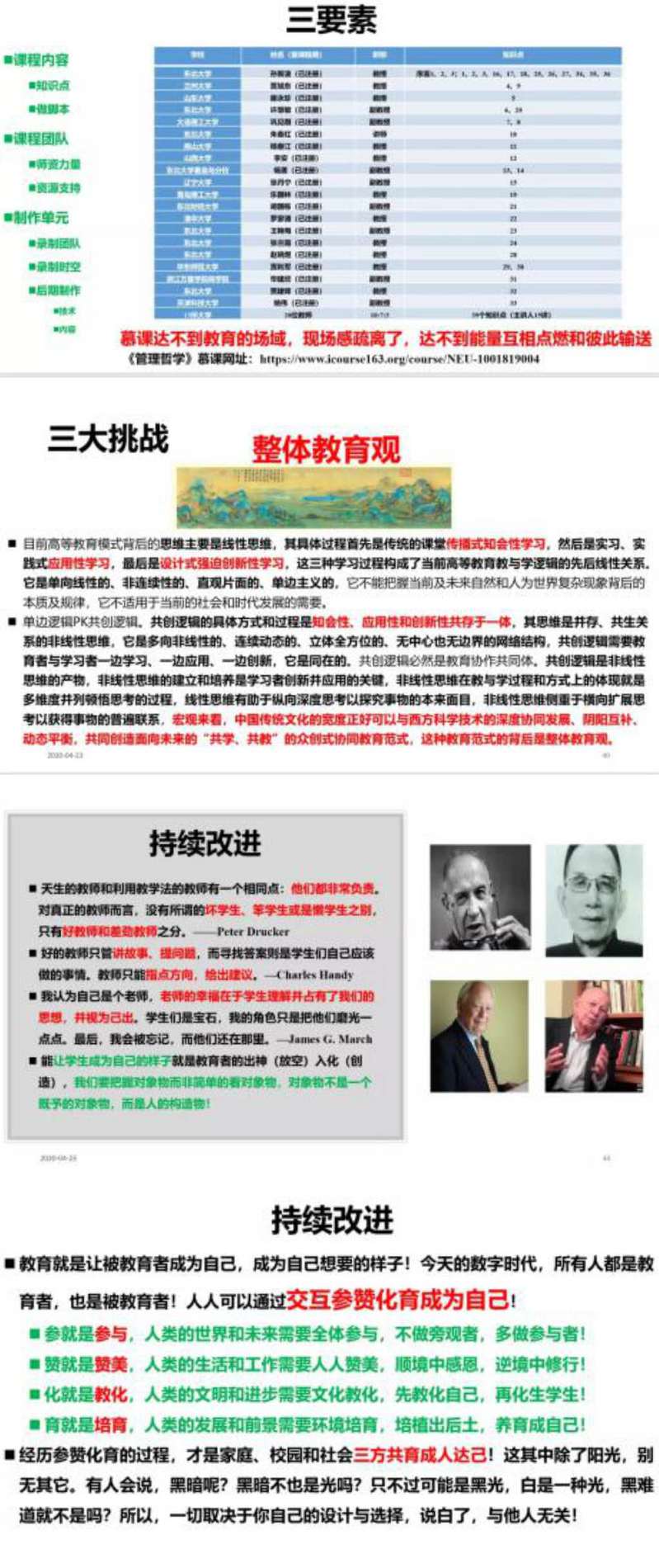本次讲座的主要内容为介绍如何设计基于“未来管理≈古代中国管理哲学×现代西方管理科学”宏观框架的《管理哲学》课程体系。孙新波结合自身操作经验,分享了如何利用最新的互联网技术等慕课平台通过团队协和的方式实现《管理哲学》慕课的设计制作实战经验。他与国内同行分享了“众创式协同教育”模式下的《管理哲学》课程现场授课的七大特色和“教育整体观”面临的三大挑战,并进行了详细的阐述与剖析,引导大家深入思考。他指出,面对挑战,要持续改进完善自我,从而达到三方共育成人达己的效果。