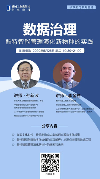 5月26日19:30-21:10,工商管理学院副院长孙新波教授以线上直播的形式开展“数据治理-酷特智能管理演化新物种的实践”专题讲座。同时参与本次讲座并担任讲师的有酷特智能工程系统总经理李金柱先生。本次讲座时长100分钟,观看人数近四千人次。