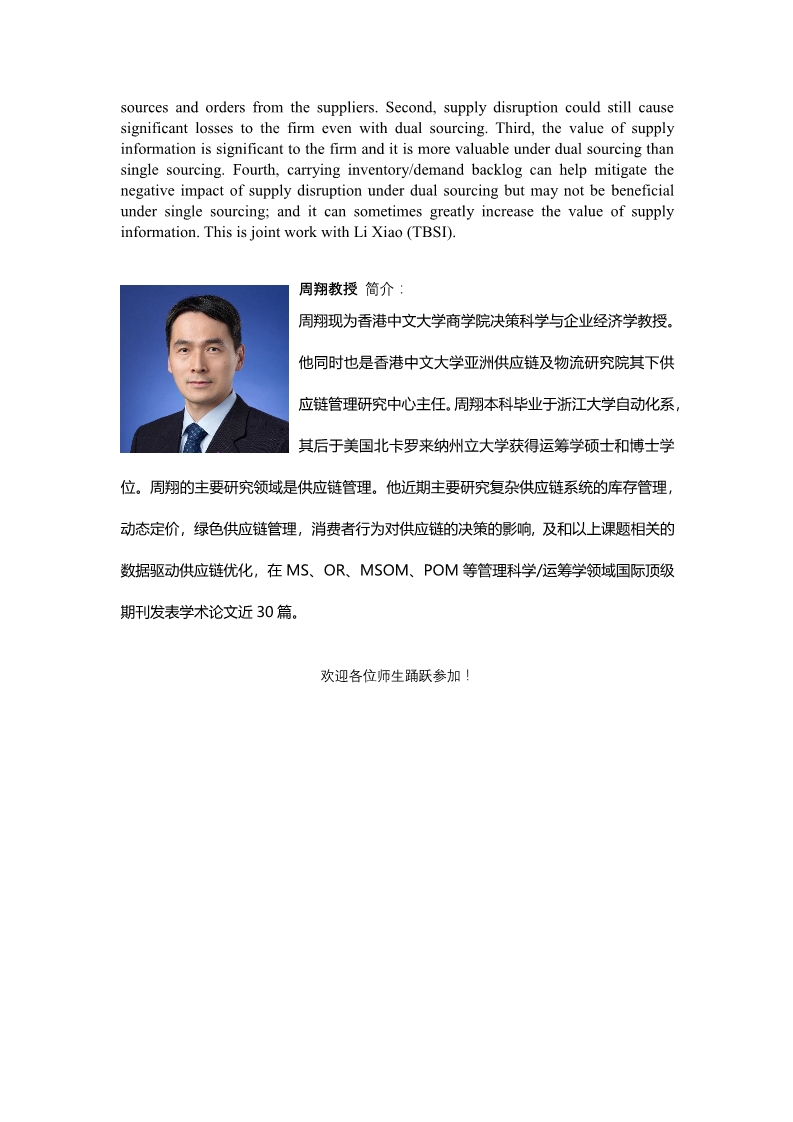 邀请香港中文大学商学院周翔教授学术报告