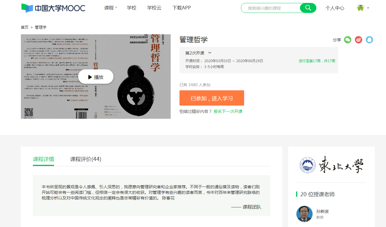 《管理哲学》作为经济管理类专业的学科基础类课程,自开设以来,2014年获批辽宁省精品资源共享课,2018年获批东北大学精品骨干课程,2019年课程配套教材《管理哲学》获批东北大学百种优质教材。同时2016年课程团队开始课程数字化转型,重构教学内容,2019年协同20余位优秀高校教师录制上线了《管理哲学》慕课,并获评东北大学慕课。