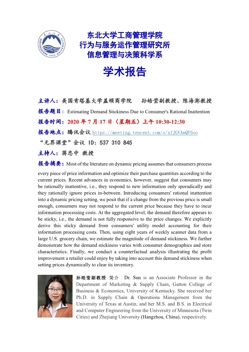 邀请美国肯塔基大学盖顿商学院孙皓莹副教授 陈海澎教授学术报告
