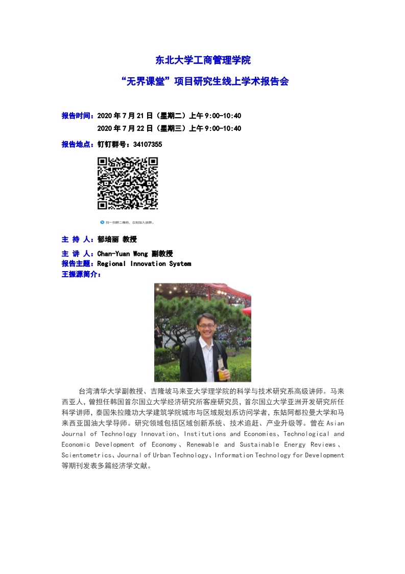 邀请台湾清华大学Chan-Yuan Wong副教授学术报告