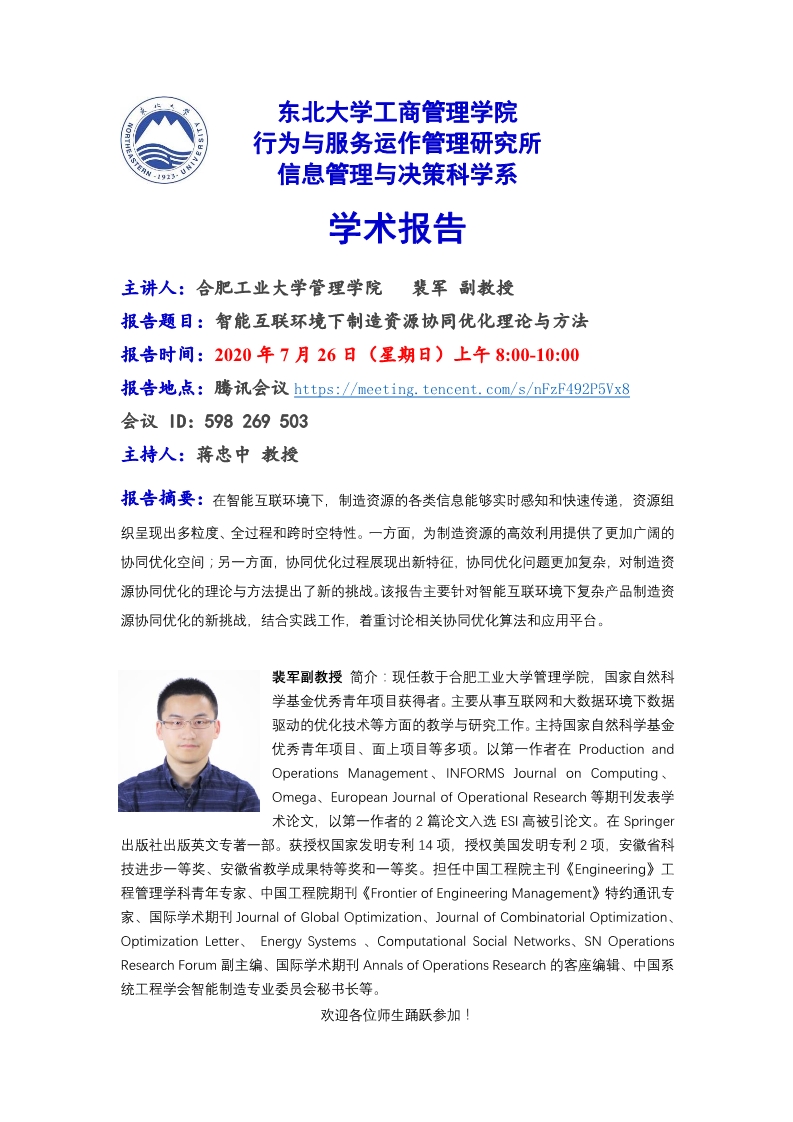 邀请合肥工业大学管理学院裴军副教授学术报告