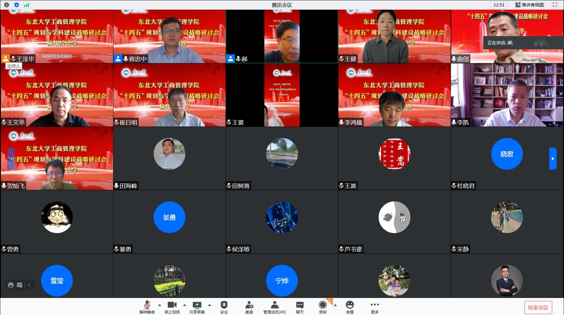 2020年8月23日上午,工商管理学院“十四五”规划与应用经济学科建设战略研讨会在线上召开。电子科技大学校长曾勇教授、北京大学城市与环境学院院长贺灿飞教授、北京物资学院党委书记王文举教授、辽宁大学研究生院院长崔日明教授、山东大学经济学院曲创教授、东北大学发展规划与学科建设处处长李鸿儒教授等专家应邀参会。学院领导班子成员、应用经济学科全体教师、相关学科教师及学院相关科室人员参加会议,会议由学院党委书记郝树满主持。