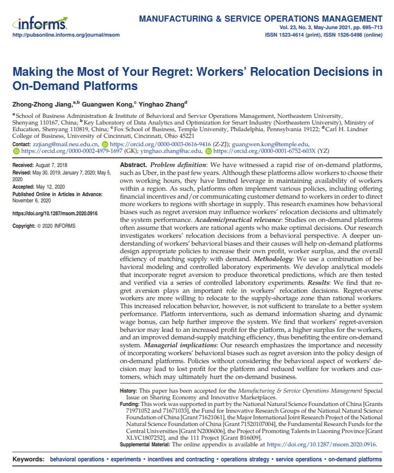 近日,我院蒋忠中教授作为第一作者的研究成果《Making the Most of Regret: Workers’ Relocation Decisions in On-Demand Platforms》在UTD24国际顶级期刊Manufacturing & Service Operations Management2021年第3期正式发表,实现了我院教师在该类国际顶级期刊论文发表的零突破,是我院高水平国际合作和高质量研究成果的重要体现和关键标志,将为学院助力学校“双一流”建设贡献力量。研究成果由东北大学工商管理学院蒋忠中教授、美国天普大学FOX商学院Guangwen Kong助理教授、美国辛辛那提大学LINDNER商学院Yinghao Zhang助理教授合作完成。