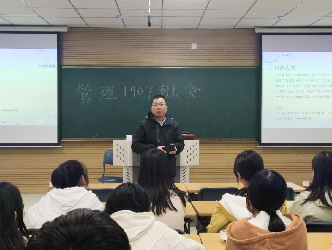 10月2416点,管理1907班全体成员在一号楼B303成功举行了本学期的第一次班会。管理1907班全体学生参加本次活动,班导师卢震出席会议。