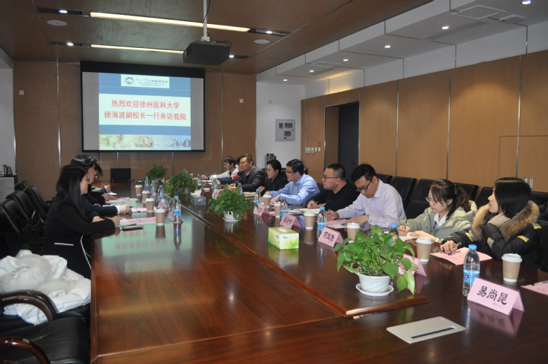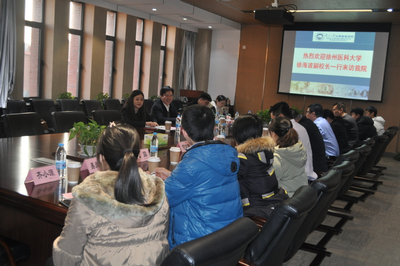 12月10日下午,徐州医科大学副校长徐海波、马克思主义学院党总支书记兼院长时统君、管理学院副院长覃朝晖(主持工作)、人事处人才办副科级秘书王茜一行至我院交流访问,院长蒋忠中、副院长赵红梅、严立宁、院办主任王寰、党委组织员王全彬及博士生代表共同接待。