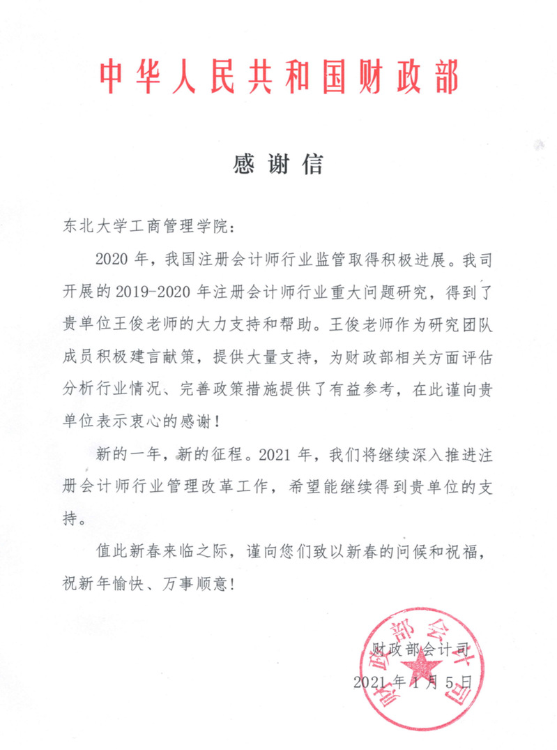近日,财政部会计司向我院发来感谢信,感谢我院会计系教师王俊在其组织开展的2019-2020年注册会计师行业重大问题研究中作为研究团队成员积极建言献策,提供大量支持,为财政部相关方面评估分析行业情况、完善政策措施提供了有益参考。