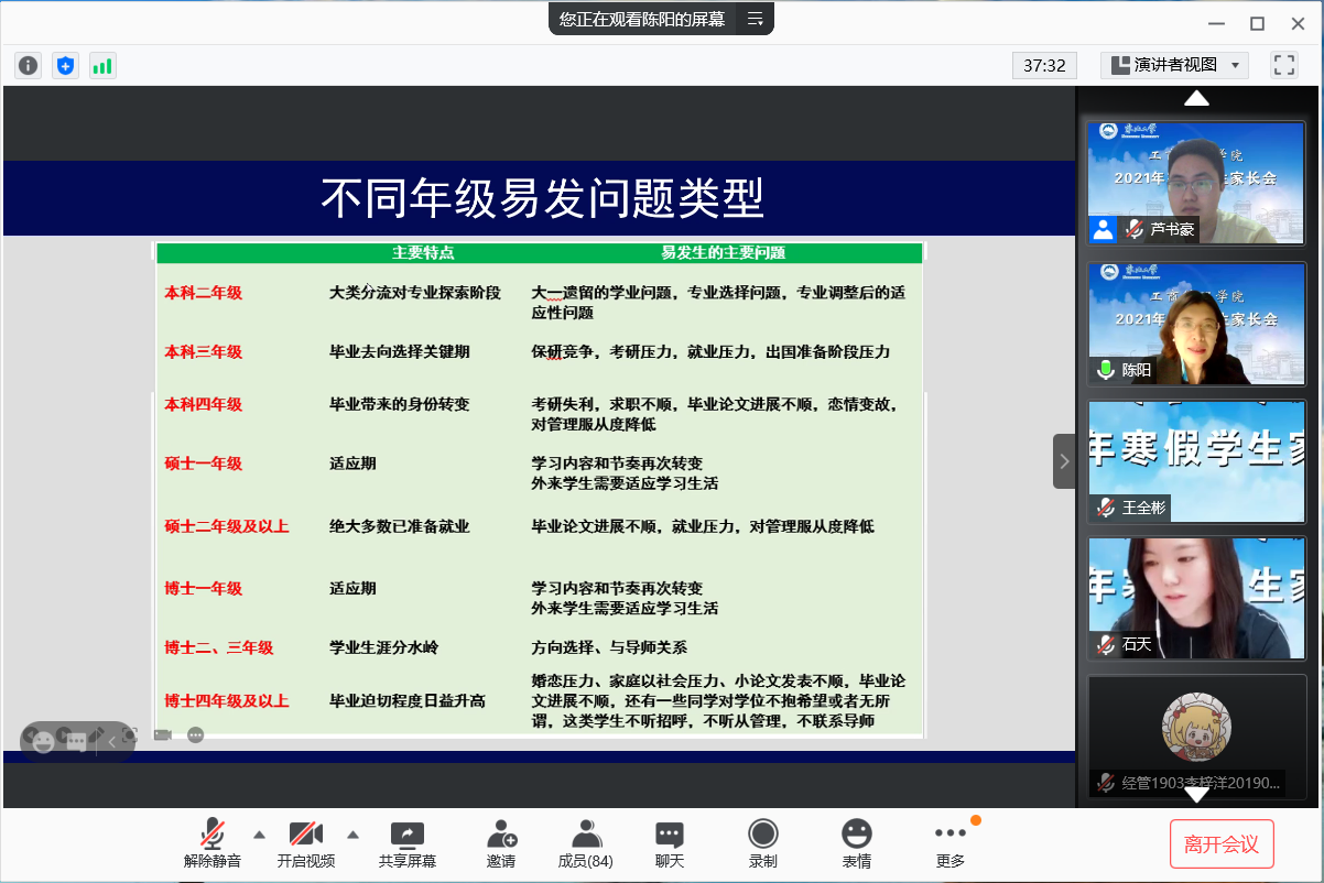 陈阳围绕《关注孩子的心理状态》与家长们交流有关大学生心理健康方面的问题,强调家长要关注大学生心理状况,倡导家校联合帮助学生拥有一个健康良好的心理状态。
