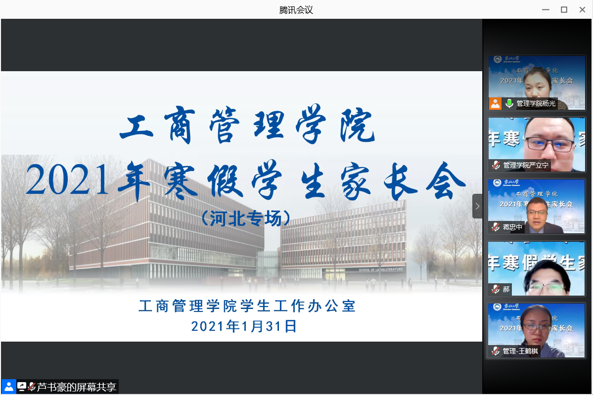 1月31日,工商管理学院开展2021年寒假河北籍本科生线上家长会。工商管理学院院长蒋忠中、党委书记郝树满、党委副书记兼副院长严立宁、东北大学心理健康教育中心主任陈阳、学院本科课程项目管理中心办公室主任石天、学生工作办公室全体老师及工商管理学院2018、2019、2020级河北籍本科生家长参加本次会议,严立宁主持会议。