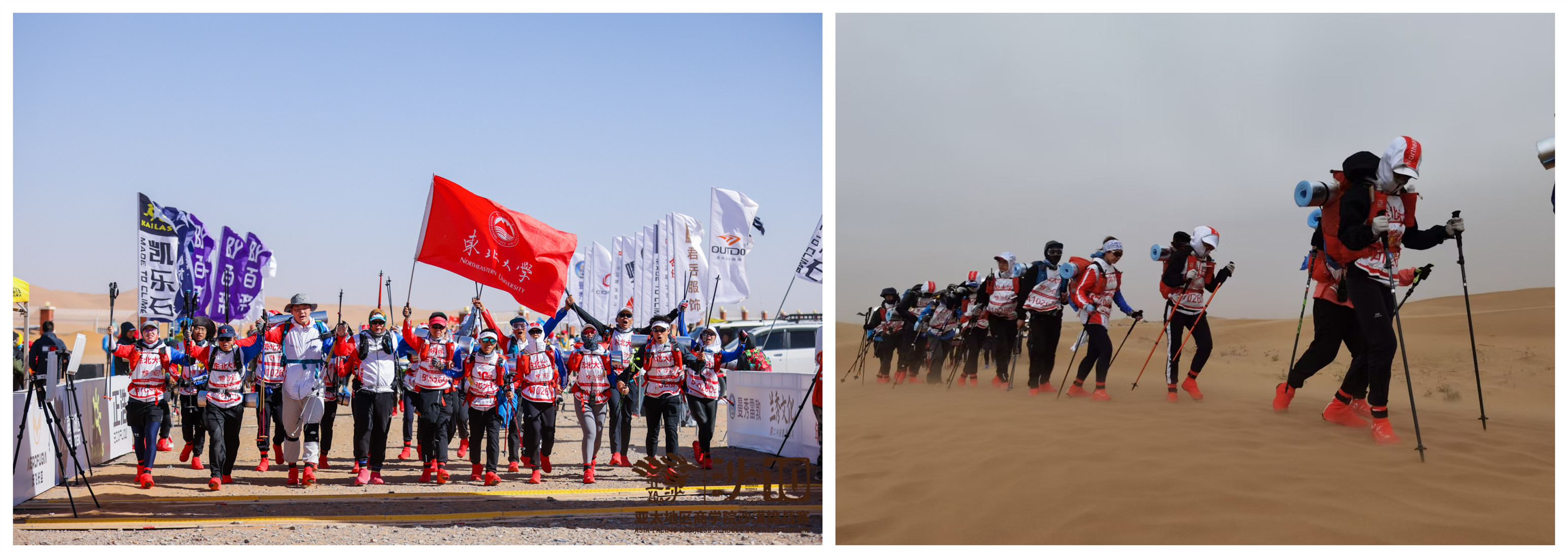 亚沙赛采用团队竞赛形式,参赛选手需负重徒步穿越70公里的沙漠路线,在三天两夜的赛程中体验并践行“环保、协作、坚持、责任”的赛事理念。东北大学MBA亚沙赛代表队自2017年组建,每年从新入学的MBA学员中招募有潜质的种子选手,历经半年严格训练,经测试选拔后确定参赛队员。东北大学MBA沙十代表队累计完成集训23期,包括路跑训练、山地训练、沙漠拉练,累计训练跑量达8994公里,最终经综合评定确定22名队员参加沙十赛,并由工商管理学院教师兰博带队。比赛过程中,队员们白天迎着风沙在广漠中奔跑,挑战自我、超越自我;夜晚在大漠浩瀚的星空下露营,总结经验、养精蓄锐。沙漠气候多变,一日可体验四季,三天里队员们经历艰难困苦,不断挑战极限,采取组队前进、协调一致的策略,在仅有4名C队辅助队员的情况下,发扬团结拼搏的团队精神,为学校首次夺得了该赛事最高荣誉“沙鸥奖”,实现了东北大学在此项赛事上的最好成绩。