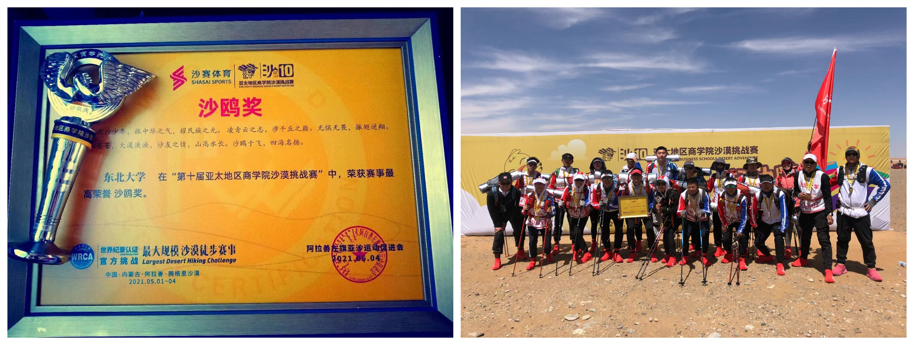 2021年5月1日至5月4日,“第十届亚太地区商学院沙漠挑战赛”(简称“沙十赛”)在中国内蒙古阿拉善盟左旗腾格里沙漠成功举办。该赛事于2012年首次举办,参赛院校覆盖中国大陆、中国台湾、中国香港、中国澳门、新加坡、澳大利亚、英国、美国等国家和地区的100多所顶级商学院,直接参与赛事MBA学生已超过10000人,覆盖50万以上亚太地区商学院MBA群体,被世界纪录(WRCA)官方认证为全球“最大规模的沙漠徒步挑战赛”,为广大MBA校友提供了一个跨院校、跨地区的商学院精英交流平台。本届共有来自121所院校的4000余人共同参赛,在亚沙十年之际创下了历届亚沙赛规模之最。