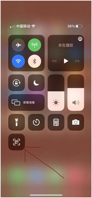 2.返回到手机界面,从手机屏幕右上角划动,出现控制中心功能界面,左下角即可看到扫一扫功能按键,如下图所示: