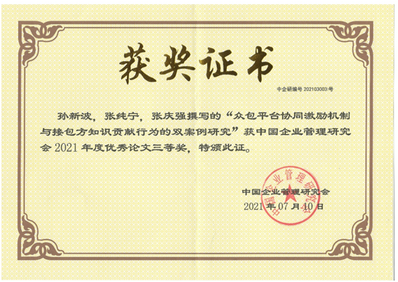 2021年7月10日,“新发展阶段的中国企业管理创新与发展”暨中国企业管理研究会2021年会顺利召开。中国企业管理研究会会长、中国社会科学院工业经济研究所黄速建研究员,中国社会科学院工业经济研究所陈于武副所长,中国社会科学院工业经济研究所沈志渔研究员,中国人民大学徐二明教授,南开大学李维安教授和白长虹教授,北京师范大学戚聿东教授,《南开管理评论》、《经济研究》、《经济学动态》、《中国工业经济》、《经济管理》和《山东大学学报(哲学社会科学版)》各知名期刊主编、副主编、编辑部主任等出席会议。我院孙新波教授团队论文《众包平台协同激励机制与接包方知识贡献行为的双案例研究》获中国企业管理研究会2021年度优秀论文奖,黄速建研究员、沈志渔研究员和朱有志教授为获奖论文颁奖。
