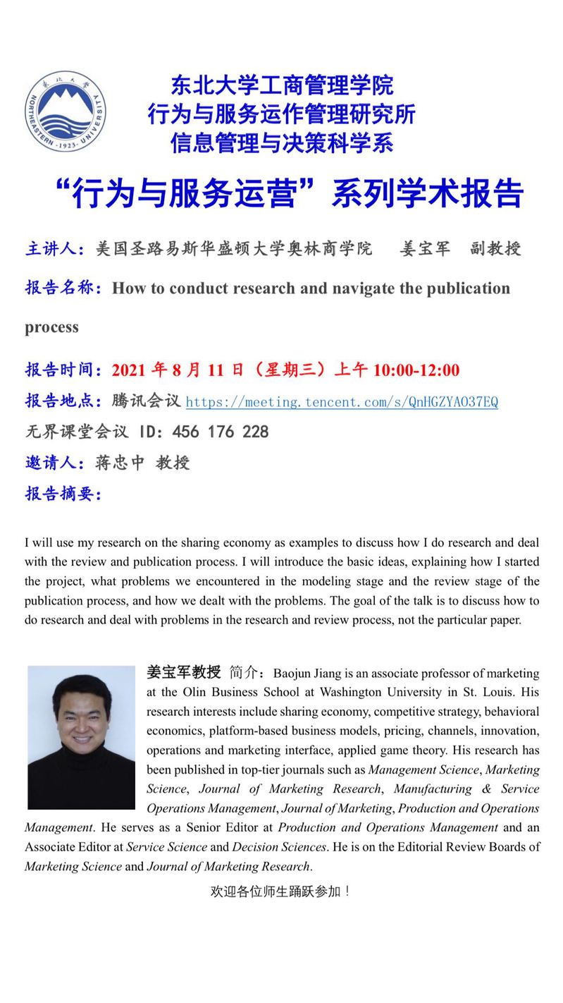 邀请美国圣路易斯华盛顿大学奥林商学院姜宝军副教授学术报告