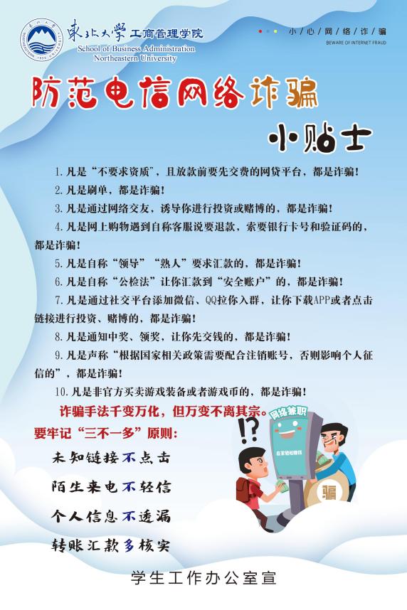 “安全教育,入耳入行”。工商管理学院学工队伍将新生入学教育前移,未入学先受教育,一入学就受熏陶,运用线下教育与线上教育相结合的形式,依托线上新生班会开展安全教育,制作防范诈骗小贴士,发送至每一位新生手中。