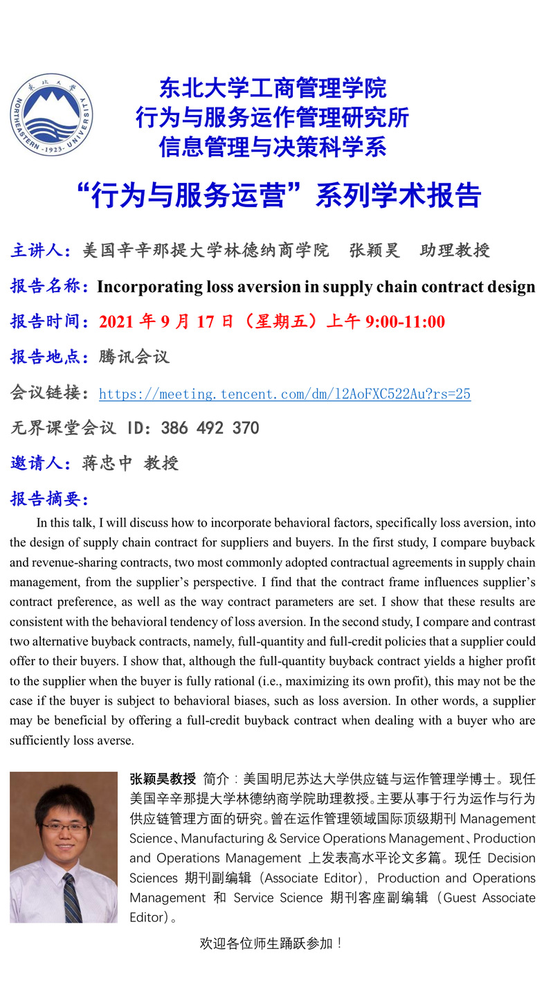 邀请美国辛辛那提大学林德纳商学院张颖昊助理教授学术报告
