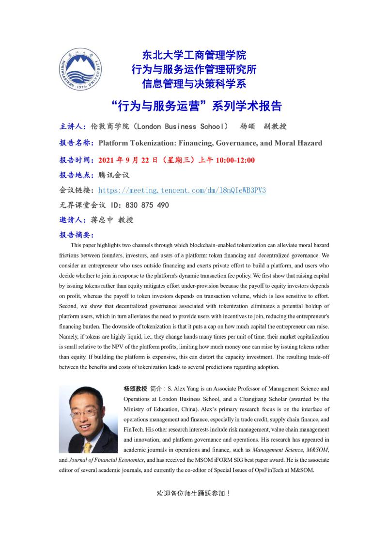 邀请伦敦商学院(London Business School)杨颂副教授学术报告