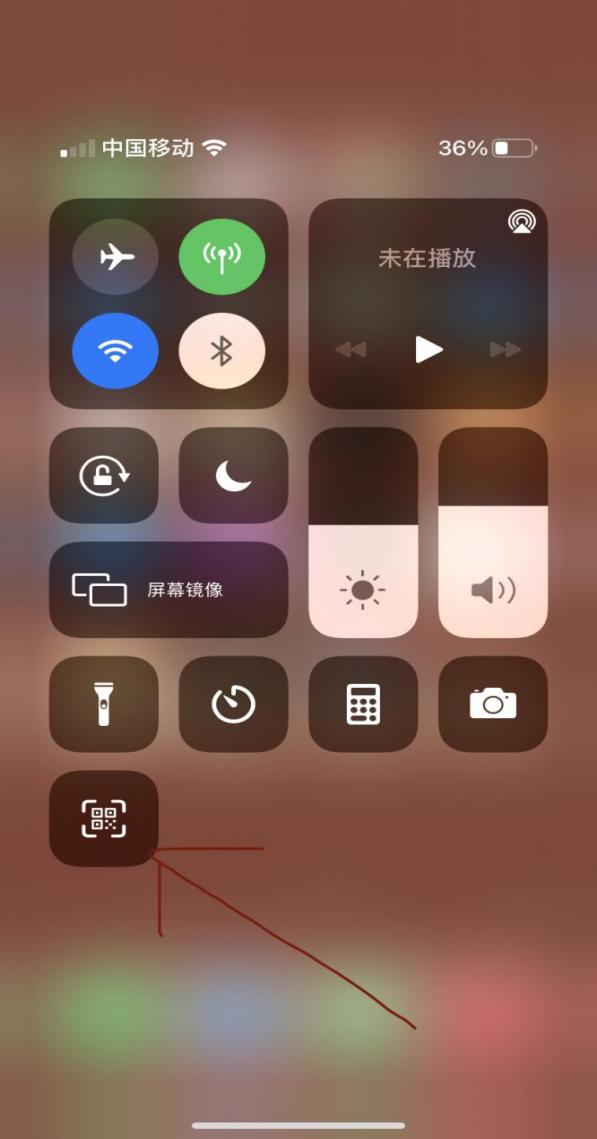 2.返回到手机界面,从手机屏幕右上角划动,出现控制中心功能界面,左下角即可看到扫一扫功能按键,如下图所示: