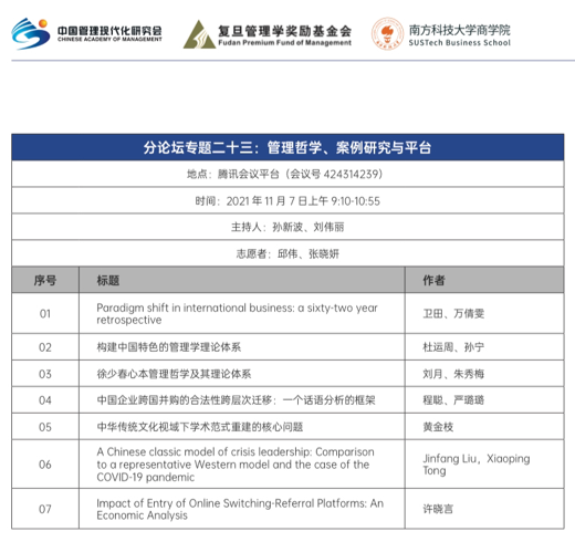 受疫情影响,2021年11月5日-7日,由中国管理现代化研究会和复旦管理学奖励基金会主办的第十六届(2021)中国管理学年会于线上召开。