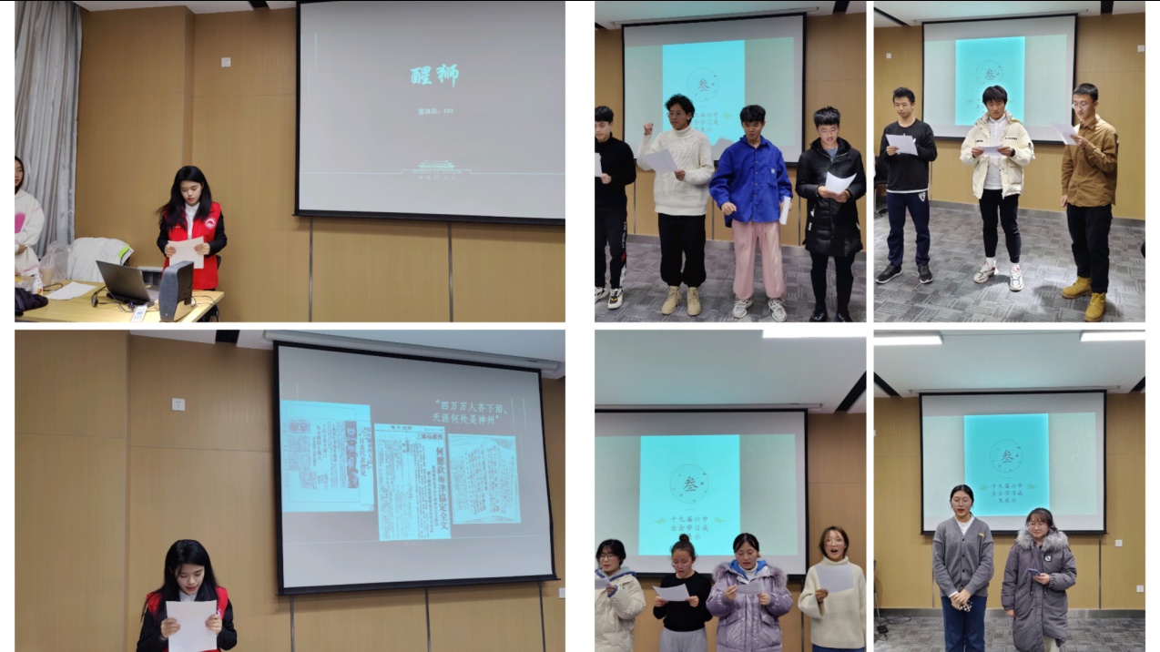 本次活动采取线上线下相结合的形式组织开展。支部成员通过集体观看习近平总书记讲话视频、撰写心得体会,深入学习了“党的十九届六中全会精神”,并以感悟分享、知识问答、诗歌朗诵等形式对学习成果进行了展示。学习报国宣讲团成员孟校竹围绕中国发展历程进行的题为《醒狮》的宣讲,激起了同学们的爱国之情;名为《诈骗之夜》的情景剧表演,提醒同学们保护个人财产安全,强化防诈骗意识。