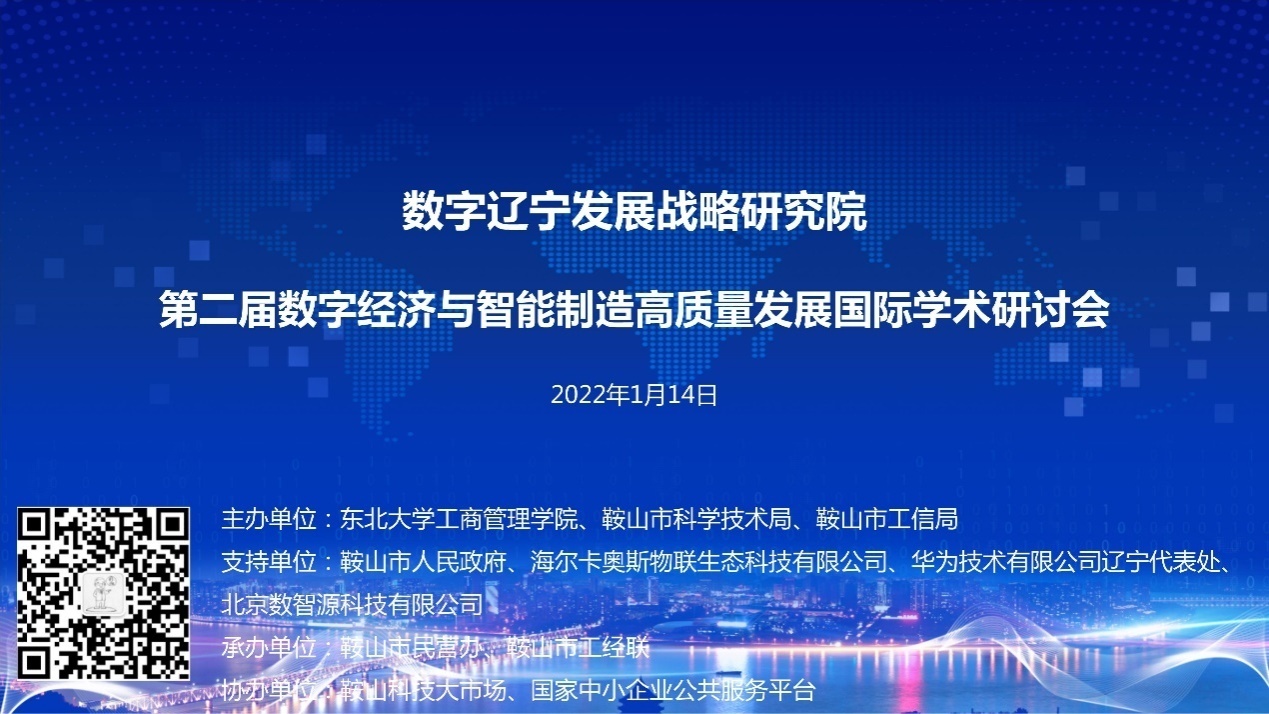 2022年1月14日,数字辽宁发展战略研究院第二届数字经济与智能制造高质量发展国际学术研讨会在鞍山市科技大市场隆重举行。本次大会由东北大学工商管理学院、鞍山市科学技术局、鞍山市工信局主办,鞍山市人民政府、海尔卡奥斯物联生态科技有限公司、华为技术有限公司辽宁代表处、北京数智源科技有限公司给予支持,鞍山市民营办,鞍山市工经联承办,鞍山科技大市场、国家中小企业公共服务平台协办。大会采取线上线下结合方式,鞍山市副市长孙平致开幕辞,北京数智源科技有限公司技术总监宋福官、海尔大客户经理郑庆成、华为云辽宁解决方案总经理李兵、宁波诺丁汉大学李平教授、首钢股份副总工程师余威、剑桥大学石涌江教授出席会议,围绕“企业数字化转型应用实践”、“专精特新企业”、“中国制造业的演化”等议题进行分享并展开热烈讨论。会议由东北大学工商管理学院副院长、数字辽宁发展战略研究院院长孙新波教授主持。