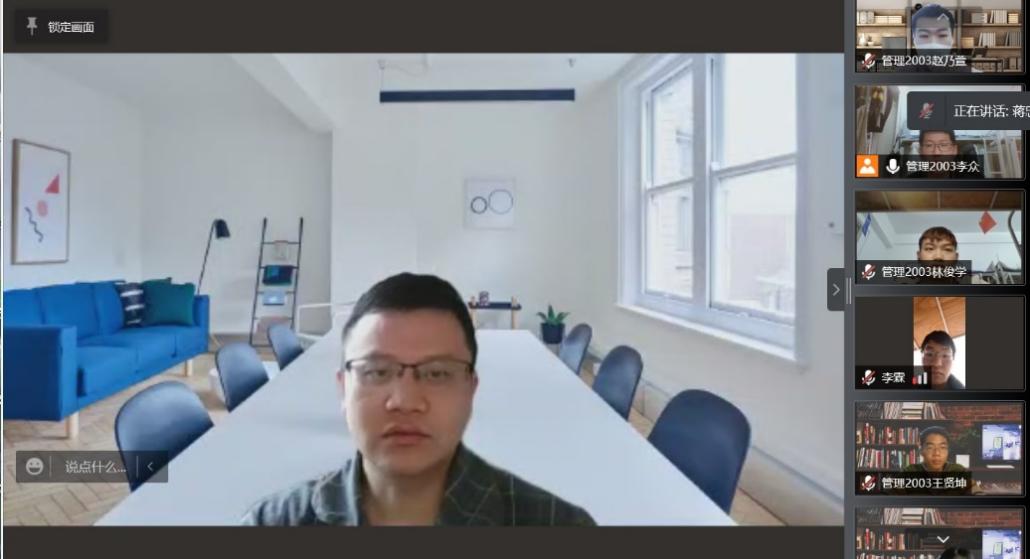 蒋院长首先关注了同学们在疫情防控期间线上学习的状态。他指出,在如今碎片化信息爆炸的时代,面对各类诱惑,保持高度自律的精神难能可贵。为此,他建议同学们树立远大的人生目标,督促并激励自己。同时,蒋院长推荐同学们阅读纸质书籍,减少使用“短平快”电子产品的时间,拓宽视野,培养深度思考的能力。他还针对同学们所关注的毕业深造问题,提供了指导性意见。他强调,现阶段同学们应将提升成绩作为根本点、出发点与着力点,同时强化数理逻辑思维能力,提高计算机与英语水平,浇筑起求学深造的坚实基础。最后,蒋院长对大家提出殷切期望,希望同学们塑造自身品行,具备“咬定青山不放松”的韧性,培育在前行路上不畏挫折,不惧失败的素质。