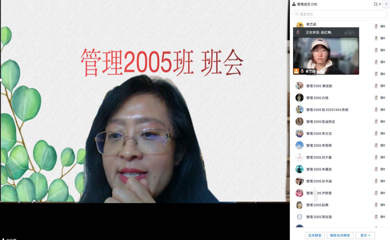 3月24日11:00,管理2005班于线上开展了新学期线上交流会,副院长赵红梅应邀出席,管理2005班全体同学参与了本次会议。