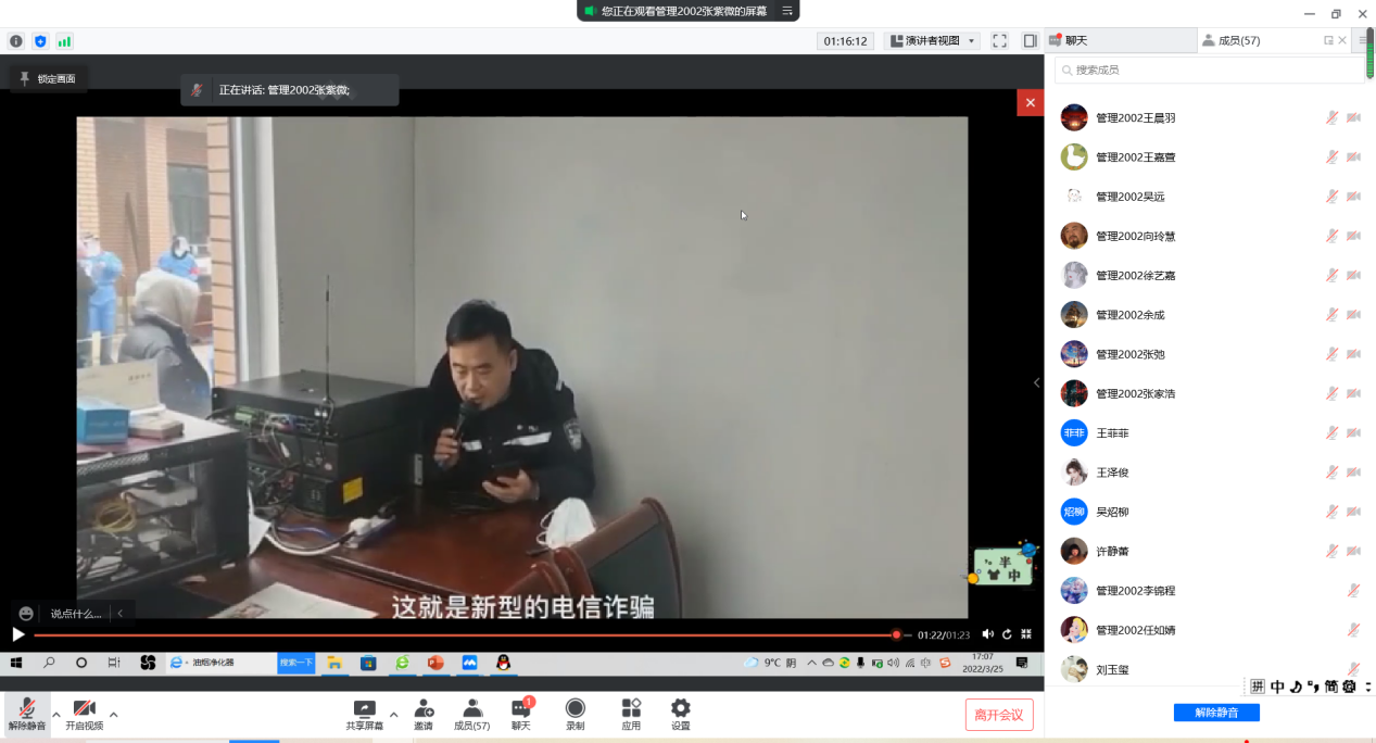 在防范电信诈骗部分,团支书通过身边诈骗案例的分享以及观看视频的方式为大家提出了预防诈骗的小技巧,提醒大家及时了解新型诈骗,将防诈意识深深注入每个人的心中。