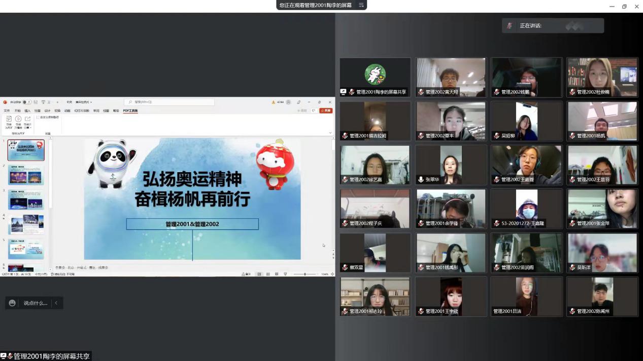 为全面贯彻党的十九大和十九届历次全会精神以及习近平总书记“七一”重要讲话精神,加强对广大青年的政治引领,引导广大青年自觉坚持党的领导,管理2001和管理2002团支部于3月25日,在线上开展以“奥运精神催奋·进学习雷锋启新程”为主题的团日活动。班导师张翠华、辅导员王守智应邀出席,本次活动两支部成员全部参加。