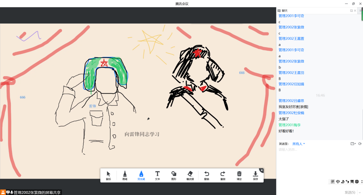 团支书对雷锋纪念日进行了介绍并观看相关视频,随后邀请成员们一起绘制雷锋画像以及雷锋日记的朗读,引导同学们要把崇高的理想信念和道德品质追求融入日常的学习生活中,从眼前做起,从小事做起,传承雷锋精神。