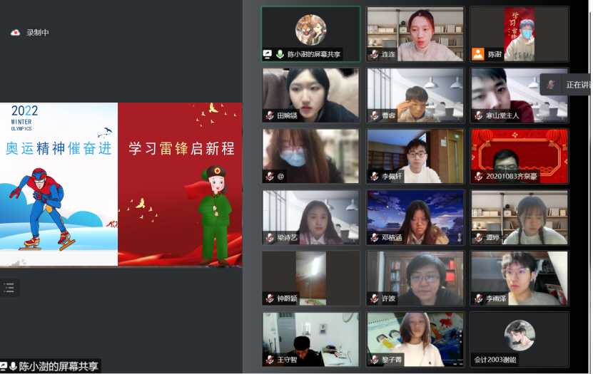 3月23日15:00,会计2003团支部利用腾讯会议在线上成功开展“奥运精神催奋进·学习雷锋启新程”主题团日活动,班导师许波、辅导员王守智应邀出席。